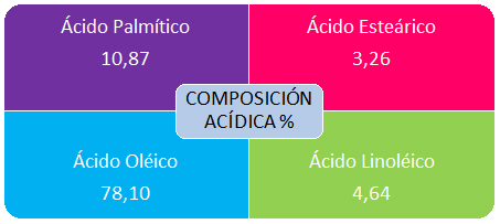 Alto contenido en ácido oleico (superando en casi un 10% a otros aceites), de elevado interés nutricional, reduce el riesgo de sufrir enfermedades cardiovasculares y hepáticas.